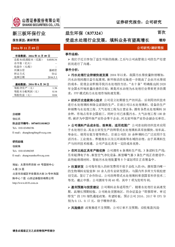 调研简报:受益水处理行业发展,填料业务有望高增长
