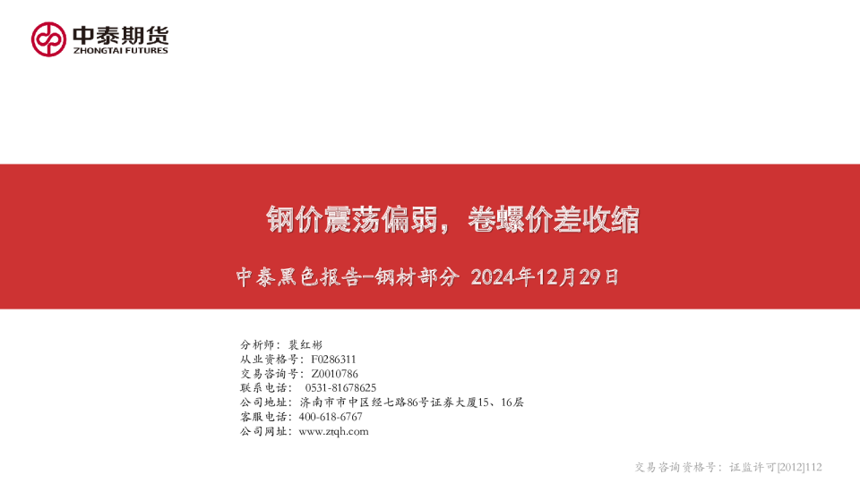 中泰黑色报告-钢材部分:钢价震荡偏弱,卷螺价差收缩