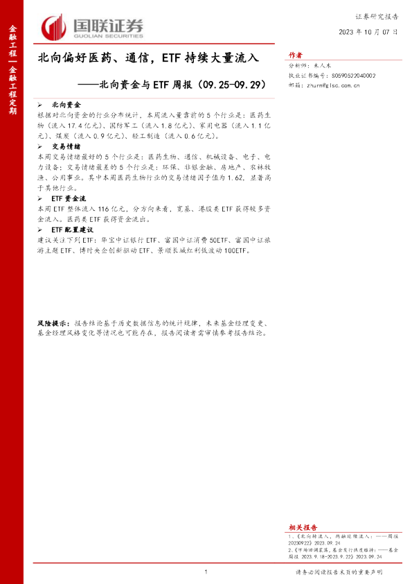 │ 北向偏好计算机、通信,ETF持续大额流入 作者 分析师:朱人木 证券研究报告 2023年08月20日 ——北向资金与ETF周报(08.14-08.19) 北向资金:流入计算机、通信 根据对北向资金的行业分布统计,本周流入量靠前的5个行业是:计算机 (流入6.6亿元)、通信(流入5.1亿元)、国防军工(流入3.3亿元)、环 保(流入2.3亿元)、纺织服饰(流入0.9亿元)。 交易情绪:医药、轻工交易情绪好 本周交易情绪最好的5个行业是:医药生物、轻工制造、非银金融、综合、 美容护理;交易情绪最差的5个行业是:电子、有色金属、汽车、农林牧渔、钢铁。其中本周医药生物行业的交易情绪因子值为1.55,显著高于其他行业。 ETF资金流 本周ETF整体流入425亿元,分方向来看,宽基类、港股类、医药类ETF 获得较多资金流入。金融类ETF获得资金流出。 ETF配置建议 建议关注下列ETF:华宝中证银行ETF、富国中证消费50ETF、富国中证旅游主题ETF、博时央企创新驱动ETF、景顺长城红利低波动100ETF。 活跃资本市场相关政策措施 证监会有关负责人就活跃资本市场、提振投资者信心答记者问,就热点问题给出了官方的回应。未来将大力发展公募基金,研究将ETF引入盘后固定价格交易机制,将ETF纳入转融通标的等政策。 未来这些政策落地,将提高公募基金的运行效率,降低公募基金的费率水平,提升基金投资者的投资体验,对活跃资本市场有非常大的促进作用。 执业证书编号:S0590522040002邮箱:zhurm@glsc.com.cn 金融工程 金融工程定期 风险提示:报告结论基于历史数据信息的统计规律,未来基金经理变更、基金经理风格变化等情况也可能存在,报告阅读者需审慎参考报告结论。 相关报告 1、《A股8月第3周(8.14-8.20)因子周报:—— 市场持续回落,小市值因子再度跑赢》2023.08.192、《短期货币流动性向好:——周报20230811》 2023.08.14 正文目录 1.活跃资本市场相关政策措施3 2.市场情绪3 2.1北向资金:流入计算机、通信3 2.2交易情绪:医药、轻工制造交易情绪好4 3.ETF资金流情况4 3.1本周ETF整体流入425亿元5 3.2ETF流入/流出前十7 4.ETF交易情绪:军工、红利类ETF类交易活跃7 5.ETF配置建议8 6.风险提示9 图表目录 北向资金行业分布3 交易情绪:非银金融、医药交易情绪好4 非货币ETF规模变化5 本周ETF整体流入425亿元5 宽基、港股、医药类ETF获得正流入,金融类获得流出6 宽基类ETF现大额流入6 ETF资金流入前十7 ETF资金流出前十7 ETF交易情绪8 ETF推荐9 1.活跃资本市场相关政策措施 2023年8月18日,证监会有关负责人就活跃资本市场、提振投资者信心答记者问,就热点问题给出了官方的回应,与公募基金相关的部分要点内容如下: 【公募基金方面】大力发展权益类基金,放宽指数基金注册条件,推进公募基金费率改革全面落地,降低管理费率水平,引导头部公募基金公司增加权益类基金发行比例,引导公募基金管理人加大自购旗下权益类基金力度,建立公募基金管理人“逆周期布局”激励约束机制,拓宽公募基金投资范围和策略。 【交易型基金、ETF方面】降低股票基金申报数量要求,研究将ETF引入盘后固定价格交易机制,将ETF纳入转融通标的等政策。(资料来源:中国证监会网站,《证监会有关负责人就活跃资本市场、提振投资者信心答记者问》) 未来这些政策落地,将提高公募基金的运行效率,降低公募基金的费率水平,提升基金投资者的投资体验,对活跃资本市场有非常大的促进作用。 2.市场情绪 2.1北向资金:流入计算机、通信 根据对北向资金的行业分布统计,本周流入量靠前的5个行业是:计算机(流入 6.6亿元)、通信(流入5.1亿元)、国防军工(流入3.3亿元)、环保(流入2.3亿元)、纺织服饰(流入0.9亿元)。 流出量靠前的5个行业是:食品饮料(流出73.1亿元)、电力设备(流出59.5 亿元)、医药生物(流出36.3亿元)、银行(流出28.0亿元)、有色金属(流出16.1 亿元)。 北向资金行业分布 行业 2023/8/11 2023/8/18 计算机 -16.8 6.6 通信 -1.2 5.1 国防军工 -4.2 3.3 环保 -1.8 2.3 纺织服饰 -0.7 0.9 石油石化 0.4 0.2 综合 0.0 0.0 交通运输 -2.3 -1.6 社会服务 -4.7 -1.7 轻工制造 1.3 -1.8 钢铁 3.0 -1.8 公用事业 -0.8 -2.5 美容护理 -1.8 -2.7 传媒 -26.1 -3.9 建筑装饰 -6.7 -4.1 房地产 2.4 -4.6 机械设备 -5.1 -4.9 基础化工 -8.9 -5.4 农林牧渔 -7.7 -6.1 商贸零售 -9.3 -6.4 家用电器 -10.6 -6.6 建筑材料 -0.2 -7.0 煤炭 -5.0 -7.5 电子 -39.6 -9.5 非银金融 40.9 -13.3 汽车 -14.4 -13.7 有色金属 -10.2 -16.1 银行 -31.0 -28.0 医药生物 -11.9 -36.3 电力设备 -25.3 -59.5 食品饮料 -27.8 -73.1 资料来源:wind,国联证券研究所整理,单位:亿元 2.2交易情绪:医药、轻工制造交易情绪好 关于交易情绪,我们构建了交易情绪因子。交易情绪-成交量因子的计算方法是: 交易情绪=过去1周日均成交金额 过去2~5周日均成交金额 然后对结果进行标准化处理。 本周交易情绪最好的5个行业是:医药生物、轻工制造、非银金融、综合、美容 护理;交易情绪最差的5个行业是:电子、有色金属、汽车、农林牧渔、钢铁。其中本周医药生物行业的交易情绪因子值为1.55,显著高于其他行业。 交易情绪:非银金融、医药交易情绪好 交易情绪最好 交易情绪最差 排序 行业名称 交易情绪 排序 行业名称 交易情绪 1 医药生物 1.55 1 电子 0.73 2 轻工制造 1.39 2 有色金属 0.76 3 非银金融 1.29 3 汽车 0.76 4 综合 1.29 4 农林牧渔 0.80 5 美容护理 1.16 5 钢铁 0.83 来源:Wind,国联证券研究所,单位:无 3.ETF资金流情