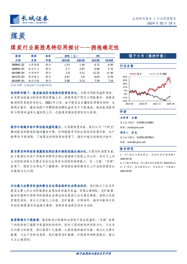 低利率环境下,煤炭板块具有较高的投资性价比。当前无风险收益率较低,未来现金流通过利率折现的现值上升,高股息资产吸引力明显提升,而煤炭板块则更具投资性价比。2021年以来,由于煤炭企业整体经营情况转好,业绩稳步提升,叠加我国十年期国债到期收益率处于下降通道,煤炭板块股息率与国债收益率比值持续上升,凸显煤炭板块投资性价比较高。 煤价中枢稳步抬升保证板块盈利能力。从供需角度来看,我们认为“十四五”期间煤炭供需格局维持整体平衡,但伴随着季节性区域性的供需矛盾。在产能释放节奏较慢,下游需求持续恢复的背景下,煤价中枢会持稳逐步抬升。 股东要求和再投资意愿较低两因素共振促进煤企高分红。从股东的角度来看,由于集团公司资产负债率和带息负债比普遍高于控股上市公司,其对于上市公司的利润有分红需求来优化自身资本结构和偿债能力。另一方面,“双碳”政策下,煤炭行业再生产门槛提高,取得煤炭新资源成本上升也促进煤炭企业提高分红比例。 分红能力由留存收益和源自自由现金流的自由现金决定。我们统计了近5年煤炭主要上市公司的每股自由现金流和留存收益,发现山煤国际、兖矿能源、潞安环能和中国神华的每股自由现金流在煤炭行业中排名靠前,说明公司经营情况较好。而从支付能力上来看,兖矿能源、中国神华、潞安环能和兰花科创的每股留存收益排名靠前,说明其具备稳定的安全边际。 投资策略与个股推荐。煤炭板块以稳健的运营资产保证高盈利,“双碳”政策下的高审批门槛提升高盈利的持续性,同时又促进板块持续高分红。从未来分红潜力的角度,我们推荐广汇能源、山西焦煤和潞安环能,建议关注冀中能源,从生产经营的角度,我们推荐兖矿能源、中国神华和陕西煤业,建议关注山煤国际。 风险提示:煤价剧烈波动、下游需求不及预期、本文对股息率测算基于一定假设,假设条件不成立、遗漏变量偏差、发生重大煤炭安全生产事故。 一、高股息策略什么时候有用? 1.1在大盘指数下跌时,高股息策略有效 大盘超跌时,红利指数相对收益较高。我们统计了2010-2023年全部交易日上证指数和红利指数表现,发现在大盘下跌时,红利指数基本上能够跑赢大盘。具体来说,从2010-2023年,上证指数年涨跌幅为负的有7次,而在这7次下跌中,红利指数有5次相对收益均高于上证指数。值得注意的是,在年跌幅超过15%的阶段性超跌阶段,红利指数表现均比上证指数出色。 图表1:上证指数与红利指数走势比较 图表2:红利指数与上证指数年涨跌幅比较 1.2低利率环境下,煤炭板块投资性价比较高 高股息是低利率环境下的稳定器。当前无风险收益率较低,未来现金流通过利率折现的现值上升,高股息资产吸引力明显提升,而煤炭板块更具投资性价比。2021年以来,由于煤炭企业整体经营情况转好,业绩稳步提升,叠加我国十年期国债到期收益率处于下降通道,煤炭板块股息率与国债收益率比值持续上升,凸显煤炭板块投资性价比较高。 图表3:我国十年期国债到期收益率(%) 图表4:煤炭行业股息率与十年期国债收益率比较(%) 1.3居民风险偏好下移,对煤炭板块配置意愿上升 投资者对资产具备安全边际需求上升。就资产配置的角度来看,投资者风险偏好有所下降,对于具备相对低风险特征的债券型基金以及货币型基金关注度显著上升。2023年,债券型基金资产净值为9.03万亿元,同比增长17.9%,较于2020年增速为80.6%,年复合增速为15.9%;货币型基金资产净值为11.28万亿元,同比增长7.9%,较于2020年增速为40.0%,年复合增速为8.8%;股票型基金资产净值为2.57万亿元,同比增长12.1%,较于2020年增速为38.8%,年复合增速为8.5%。在股票市场中,机构投资者对于煤炭板块配置意愿同样有所抬升,从2023年二季度以来,申万煤炭行业机构持仓市值占比持续上升,2023年四季度,煤炭板块持仓占比为1.36%,同比增长0.35pct,环比增长0.31pct。 图表5:不同类型基金资产净值增速 图表6:申万煤炭行业机构持仓市值占比 二、煤炭行业为什么会具备高股息特征?是否可以持续? 股息率由分红比例、ROE和PB共同决定。截至2024年2月27日,在31个申万行业中,煤炭行业净资产收益率( TTM )为15.43%,仅次于食品饮料(20.40%)和家用电器(16.34%)。煤炭行业市净率为1.72,处于行业中较低水平。而煤炭行业分红比例为51.06%,在处于行业较高水平。分子端高于行业平均,分母端也处于较低水平,双重因素共振导致煤炭行业股息率明显高于申万其他行业。 图表7:股息率计算公式 图表8:申万行业市净率与ROE( TTM )比较 图表9:申万行业股息率与分红比例比较 2.1从ROE角度来看,核心在煤价中枢稳步抬升 从供需角度来看,“十四五”期间煤炭供给增速低于需求增速。我们在《底部已过,渐至佳境——煤炭行业2024年策略报告》中指出,原煤产量增速已经放缓,并且由于“双碳”政策提高新建煤矿的门槛,煤炭新批产能呈下降趋势,未来我国煤炭供给增量将很大程度上依赖从印尼、澳大利亚等国的进口。而由于当地自身生产条件、环保政策等影响,持续高输入的进口量难以保证,且市场价格波动较大。另一方面,考虑到我国能源结构,火力发电将在较长一段时间内承担能源供应的压舱石角色,“十四五”期间电力行业对动力煤的需求会维持小幅增长的趋势。而且在地产行业逐渐摸底的过程中,以钢铁为主要代表的非电需求韧性