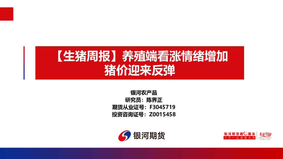 养 殖 端 看 涨 情 绪 不 断 升 温20240526 蒋 琴交易咨询号:Z0014038从业资格号:F30278080769-22110802 审核:段福林交易咨询号:Z0015600 周度观点及策略1期现市场2产能3供给端4需求端5成本及利润6 周度观点及策略 基本面观点 u现货:上周猪价震荡上行,市场情绪坚挺,周度重心再度上移。据我的农产品网数据显示,全国生猪出栏均价在15.79元/公斤,较上周上涨0.65元/公斤,环比上涨4.294%,同比上涨11.35%。目前养殖端看涨情绪浓厚,散户压栏惜售,集团缩量挺价出猪叠加二次育肥入场的共同刺激下,猪价加速上涨。 u产能:据国家统计局数据统计,截止到2024年一季度末,全国生猪出栏19455万头,同比下降2.2%;生猪存栏40850万头,同比下降5.2%;能繁母猪存栏3992万头,同比下降7.3%;环比减少150万头,下降3.6%。自2023年一季度起能繁母猪存栏连续5个季度环比下降,体现当前生猪供给边际逐步向好。能繁母猪存栏虽同比下降7.3%,但仍相当于3900万头正常保有量的102.4%,处于产能调控绿色合理区域。同时,养殖端母猪存栏结构及性能优势在近几年“高补低淘”的调配下,亦同比明显提升,且整体配种意愿、数量也未见明显下降。从新生仔猪数量看,2023年10月起新生仔猪数量开始减少,2024年3月止降回升,在此期间新生仔猪数量同比下降4.9%。结合6个月的育肥出栏周期和消费季节性转变,生猪供应宽松格局将逐步得到缓解,猪价重心中期上移预期浓厚。 基本面观点 u消费端:目前冻品库存依旧高位,尽管市场认为猪少了,但肉并不少。整体而言,二季度供需端对行情支撑力度仍相对有限,当前行情走向很大程度依赖于市场情绪、规模场短期出栏节奏变化、二次育肥行为等不确定性较大的因素。 u关注规模场出栏计划调整、市场情绪变化、终端需求增量、出栏体重调整、二育动态及冻品库存等因素。 策略观点与展望 u展望中期来看,去产能预期以待,猪价整体向好趋势不变。目前养殖场主动淘汰意愿一般,标肥价差回归,规模企业持续压栏增重意向低,供应维稳。节后市场需求回落,冻品猪肉消化缓慢,加之各地气温普遍升高,白条走货减淡,厂家整体开工低于去年。整体来看,短期市场供需僵持调整有限,企业出栏节奏平稳延续,需求疲软近况难改,短期供强需弱预期下行情窄偏弱运行。 u单边:2409合约预期偏多,但已有大幅升水反映了后市的涨价预期,对于养殖端来说盘面已可锁利套保,建议产业投资者谨慎偏空对待,短线压力位参考18650,支撑位17200。 u套利:9-11反套。 产业链结构 期现市场 生猪期现货价格 资料来源:MYSTEEL、华联期货研究所 资料来源:MYSTEEL、华联期货研究所 u上周猪价震荡上行,市场情绪坚挺,周度重心再度上移。据我的农产品网数据显示,全国生猪出栏均价在15.79元/公斤,较上周上涨0.65元/公斤,环比上涨4.294%,同比上涨11.35%。目前养殖端看涨情绪浓厚,散户压栏惜售,集团缩量挺价出猪叠加二次育肥入场的共同刺激下,猪价加速上涨。 期货价差 资料来源:MYSTEEL、华联期货研究所 资料来源:MYSTEEL、华联期货研究所 期货价差 资料来源:MYSTEEL、华联期货研究所 资料来源:MYSTEEL、华联期货研究所 生猪标肥价格 资料来源:MYSTEEL、华联期货研究所 资料来源:MYSTEEL、华联期货研究所 标肥、毛白价差 资料来源:MYSTEEL、华联期货研究所 资料来源:MYSTEEL、华联期货研究所 北方地区二次育肥进场积极推高标猪价格。其次进入高温天气,肥猪消费转淡,市场无需求,肥猪价格微跌。 仔猪&二元母猪价格 资料来源:MYSTEEL、华联期货研究所 资料来源:MYSTEEL、华联期货研究所 仔猪价格的变化是市场情绪的先行指标,仔猪价格能够更好的反映产业端对未来猪价的预期变动。周内7公斤断奶仔猪报价弱稳伴跌,前期高价仔猪成交不畅,近期跌价后外销尚可,但市场仍有下调预期,短期仔猪价格走势偏弱盘整。二元母猪成交有限,养殖端补栏情绪降温,短期价格难有上涨空间,小幅震荡为主。 淘汰母猪价格 资料来源:MYSTEEL、华联期货研究所 资料来源:MYSTEEL、华联期货研究所 当前养殖场主动淘汰意愿一般,市场供给偏紧,短期来说,淘汰母猪价格或维持窄幅调整。 产能 能繁母猪存栏量(中国农业部) 资料来源:MYSTEEL、华联期货研究所 资料来源:MYSTEEL、华联期货研究所 据国家统计局数据统计,截止到2024年一季度末,全国生猪出栏19455万头,同比下降2.2%;生猪存栏40850万头,同比下降5.2%;能繁母猪存栏3992万头,同比下降7.3%;环比减少150万头,下降3.6%。自2023年一季度起能繁母猪存栏连续5个季度环比下降,体现当前生猪供给边际逐步向好。能繁母猪存栏虽同比下降7.3%,但仍相当于3900万头正常保有量的102.4%,处于产能调控绿色合理区域。 能繁母猪存栏量(钢联统计) 资料来源:MYSTEEL、华联期货研究所 资料来源:MYSTEEL、华联期货研究所 据Mysteel农产品208家定点样本企业数据统计,4月份能繁母猪存栏量为485.76万头,环比涨0.87%,同比减少4.59%。随养殖端饲料成本回落,4月份养殖端企业盈利继续增加,加之业内对后市行情看好,规模企业持续进行产能优化。再次,仔猪价格高位,同步带动前期中小养殖户补栏怀孕母猪意愿,随上游产能陆续转化,多地能繁母猪存栏量继续小增。5月份来看,猪价仍有跌后看涨预期,支撑养殖端上游产能调整。但南方开始进入多雨季节,高温高湿天气仍是猪瘟疫情影响的不确定因素,预计下月国内能繁母猪存栏或稳中震荡为主。 能繁母
