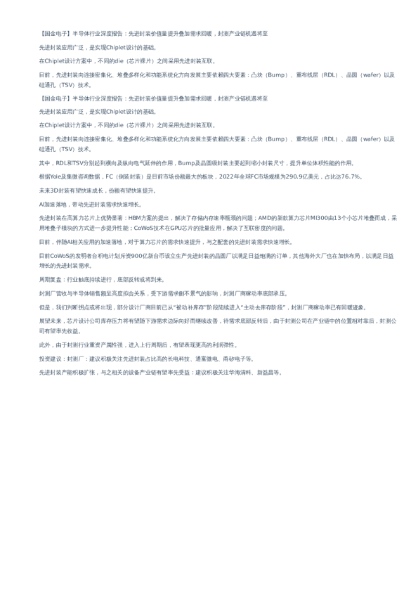 证券研究报告|2024年09月19日 半导体行业专题: 先进封装超越摩尔定律,晶圆厂和封测厂齐发力 行业研究·行业专题电子·半导体 投资评级:优于大市(维持) 证券分析师:胡剑 证券分析师:胡慧 证券分析师:叶子 证券分析师:詹浏洋 联系人:李书颖 021-60893306 021-60871321 0755-81982153 010-88005307 0755-81982362 hujian1@guosen.com.cnS0980521080001 huhui2@guosen.com.cnS0980521080002 yezi3@guosen.com.cnS0980522100003 zhanliuyang@guosen.com.cnS0980524060001 lishuying@guosen.com.cn 后摩尔时代,先进封装获重视 一方面,当前先进芯片发展面临“存储墙”“面积墙”“功耗墙”和“功能墙”,仅依靠先进制程无法解决,先进封装成为重要助力。另一方,随着工艺制程进入10nm以下,芯片设计成本快速提高。根据IBS的数据,16nm工艺的芯片设计成本为1.06亿美元,5nm增至5.42亿美元。同时,由于先进制程越来越接近物理极限,摩尔定律明显放缓,侧重封装技术的 MorethanMoore路径越来越被重视。根据Yole的预测,2023年全球先进封装营收为378亿美元,2029年增长到695亿美元,2023-2029年的CAGR达10.7%。其中2.5D/3D封装增速最快;高端封装市场规模将从2023年的43亿美元增长至2029年的280 亿美元,CAGR达37%;先进封装领域资本开支将从2023年的99亿美元提高至2024年的115亿美元。 先进封装技术多样,目的是提高集成度和性能并降低成本 先进封装技术包括FO(扇出型封装)、WLCSP(晶圆级芯片规模封装)、FCCSP(倒装芯片级封装)、FCBGA(倒装芯片球栅阵列封装)、2.5D封装、3D封装、ED(芯片封装)、SiP(系统级封装)等。相比传统封装技术,先进封装由有线变为无线,从芯片级封装拓展至晶圆级封装,从单芯片封装拓展至多芯片封装,从2D封装拓展至2.5D/3D封装,从而缩小封装体积、增加I/O数、提高集成度和性能,并降低成本。Chiplet(芯粒/小芯片)是后摩尔时代的重要路径,相比SoC,具有更高的灵活性、可扩展性和模块化,根据martket.us的预测,全球Chiplet市场规模将由2023年的31亿美元增长至2033年的1070亿美元,CAGR约42.5%。 晶圆厂和封测厂均积极布局先进封装,相互之间既有竞争也有合作 晶圆厂依靠前道工艺优势入局先进封装。先进封装,尤其是高端封装的实现越来越依赖前道技术,台积电、英特尔和三星等晶圆厂优势突出,凭借先进封装需求走高,2023年台积电、英特尔、三星的封装收入分别位列全球第三到第五。 台积电:2008年成立集成互连与封装技术整合部门,专门研究先进封装技术,重心发展扇出型封装InFO、2.5D封装CoWoS和3D封装SoIC。英伟达H100、A100、B100均采用CoWoS封装,在AI强劲需求背景下,台积电CoWoS产能持续紧张,除持续扩产外,台积电也积极与OSAT厂商合作。台积电表示未来只会专注最前沿的后道技术。 三星:提供2.5D封装I-Cube、3D封装X-Cube等,2022年12月在半导体业务部门内成立先进封装(AVP)业务团队,2024年7月AVP业务团队重组为AVP开发团队,以加强2.5D、3D等先进封装技术。 英特尔:提供2.5D封装EMIB、3D封装Foveros等。 OSAT厂商发力先进封装以获取价值增量。相比传统封装,先进封装不仅需求增速更高,在产业链中的价值占比也更高,传统OSAT(OutsourcedSemiconductorAssemblyandTesting,委外半导体封测)大厂如日月光、长电科技等为了获取更高的市场份额和价值量,均在大力发展先进封装技术,2023年前六大OSAT厂商约41%资本开支投向了先进封装。 投资策略:推荐长电科技、通富微电、伟测科技等。 风险提示:国产替代进程不及预期;下游需求不及预期;行业竞争加剧的风险;国际关系发生不利变化的风险。 01 后摩尔时代,先进封装获重视 03 晶圆厂依靠前道工艺优势入局先进封装 02 OSAT厂商发力先进封装以获取价值增量 04 先进封装标的推荐 后摩尔时代,先进封装获重视 芯片封装和测试是芯片制造的关键一环。芯片封装是用特定材料、工艺技术对芯片进行安放、固定、密封,保护芯片性能,并将芯片上的接点连接到封装外壳上,实现芯片内部功能的外部延伸。芯片封装完成后,芯片测试确保封装的芯片符合性能要求。通常认为,集成电路封装主要有电气特性的保持、芯片保护、应力缓和及尺寸调整配合四大功能。 图:半导体封装工艺示意 图:半导体企业的主要经营模式 半导体产业垂直分工造就专业委外封装测试企业(OSAT)。半导体企业的经营模式分为IDM(垂直整合制造)和垂直分工两种主要模式。IDM模式企业内部完成芯片设计、制造、封测全环节,具备产业链整合优势。垂直分工模式芯片设计、制造、封测分别由芯片设计企业(Fabless)、晶圆代工厂(Foundry)、封测厂(OSAT)完成,形成产业链协同效应。 资料来源:华虹公司招股说明书,国信证券经济研究所整理资料来源:上海新阳招股说明书,国信证券经济研究所整理 封测行业随半导体制造功能、性能、集成度需求提升不断迭代新型封装技术。迄今为止全球集成电路封装技术一共经历了五个发展阶段。当前,全球封装行业的主流技术处于以CSP、BGA为主的第三阶段,并向以系统级封装(SiP)、倒装焊封装(FC)、芯片上制作凸点(Bumping)为代表的第四阶段和第五阶段封装技术迈进。全球半导体封装行业保持稳定增长,先进封装市场规模将于2027年首次超过传统封装。根据SemiconductorEngineering预测,全球半导体封装市场规模将由2020年650.4亿美元增长至2027年1186亿美元,复合增长率为6.6%。先进封装复合增长率超过传统封装,有望于2027年市场规模超过传统封装,达到616亿美元。 图: