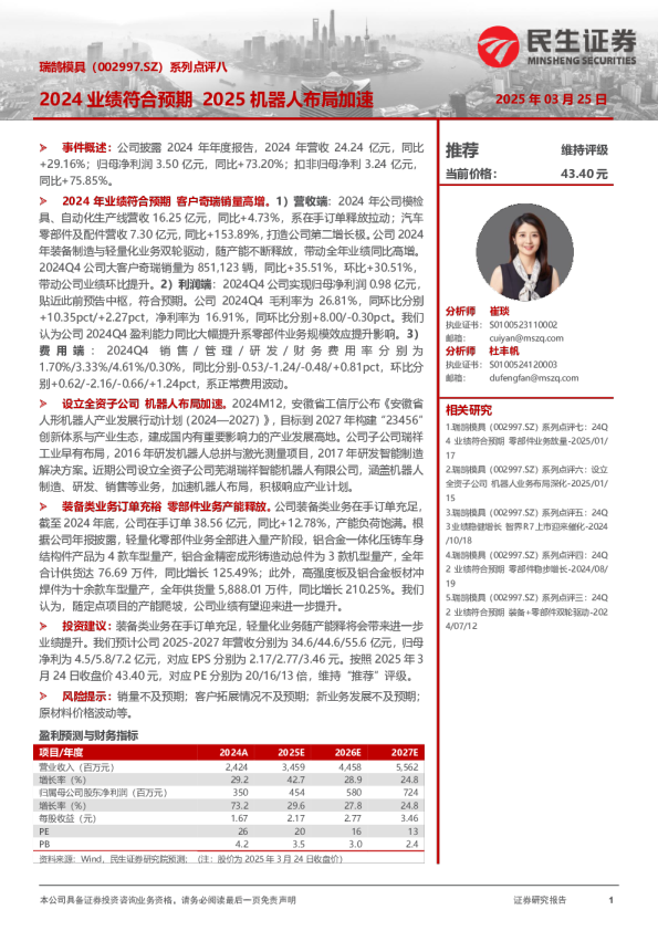 事件概述:公司披露2024年年度报告,2024年营收372.18亿元,同比+37.63%;归母净利润41.16亿元,同比+126.53%;扣非归母净利34.69亿元,同比+145.21%;公司发布2024年度利润分配预案:以目前公司享有利润分配权的股份总额2,213,939,223股为基数,向全体股东每10股派发现金红利人民币10元(含税)。 2024Q4业绩超预期2025年指引乐观。1)营收端:2024Q4营收131.43亿元,同比+62.43%,环比+69.82%。2024Q4公司客车销量为15,572辆,同比+52.03%,环比+44.31%,带动公司营收同环比增长,符合预期。2)利润端:2024Q4公司实现归母净利润1.68亿元,同比+119.73%,环比+122.18%,接近此前业绩预告上限。 公司2024Q4毛利率为25.90%, 同环比分别-6.02pct/+13.58pct,净利率为12.90%,同环比分别+3.30/+2.92pct。我们认为公司2024Q4盈利能力同环比大幅提升系规模效应提升及产品结构改善所致。 3)费用端:2024Q4销售/管理/研发/财务费用率分别为3.46%/1.42%/5.13%/-0.64%,同比分别-2.57/-0.90/-0.84/-0.27pct,环比分别+8.19/-0.69/+0.29/-1.08pct,销售费用环比大幅提升主要系会计准则变更导致。4)指引:根据公司年报,2025年公司收入计划为421.33亿元,营业成本及费用计划为372.03亿元,体现公司对经营管理的充分信心。 客车出海龙头海外市场拓展加速。公司是客车出海龙头,2024年累计出口客车1.40万辆,同比+37.73%,出口市场份额为22.65%,位居行业第一。根据中国客车统计信息网,2024年公司新能源客车出口0.27万辆,同比+84.55%。 截至2024年年报,公司已在海外40多个国家或地区形成批量销售并实现良好运营,已累计销售新能源客车超过7,000辆,海外市场拓展加速。 公交车以旧换新政策落地带动国内公交车需求。2024年7月31日交通运输部发布《新能源城市公交车及动力电池更新补贴实施细则》:新能源城市公交车更新每辆车平均补贴8万元,动力电池更换每辆车平均补贴4.2万元;我们认为,政策的延续和落地有望促进老旧车辆的更新换代,拉动公司国内新能源公交车销量增长。 投资建议:公司长期保持分红传统,2024年公司每股派发分红1.0元,合计派发现金分红33.2亿元,假设2025年分红金额与2024年一致,根据当前股价 , 对应股息率5.66%。我们预计公司2025-2027年营收分别为422.5/485.5/558.9亿元,归母净利为45.5/53.2/60.0亿元,对应EPS分别为2.05/2.40/2.71元。按照2025年3月31日收盘价26.51元,对应PE分别为13/11/10倍,维持“推荐”评级。 风险提示:政策落地不及预期;海外市场销量不及预期等。 盈利预测与财务指标项目/年度 公司财务报表数据预测汇总 利润表(百万元)营业总收入营业成本 资产负债表(百万元)货币资金 现金流量表(百万元)净利润