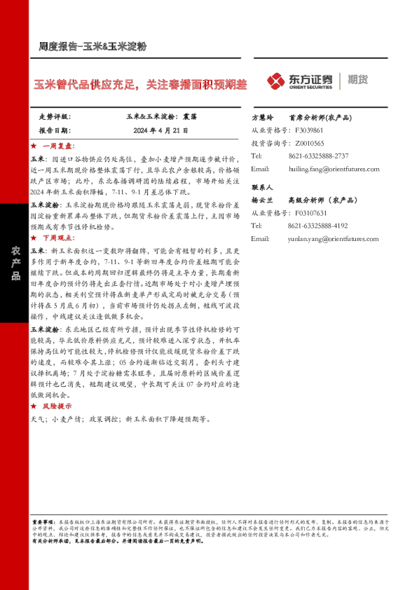 2025年4月20日 玉米周度报告 报告要点: 创元研究 国内方面,18日锦州港15水710容重玉米收购价格2160-2180元/吨,蛇口港散船二等玉米保价2250-2270元/吨。本周全国售粮进度继93%,同比快5%,东北和华北售粮进度分别94%、91%,产区基层余粮基本见底。小麦收获在即,贸易商腾库出粮,但华北地区受持续干旱影响,小麦有减产预期,本周小麦偏强5-10元/吨,小麦玉米价差持稳。天气方面,近一个月东北降雨量距平超100%,近10天辽宁和吉林东部地区距平低1-2℃,云贵川地区则偏干,或影响玉米春播。需求方面,深加工企业亏损,需求量下滑,但余粮减少,为维持库存水平仍在提价锁粮,除华北地区外均有不同程度去库;饲料企业总体库存水平处于相对高位,垒库速度放缓,短期或以消化库存滚动补库为主。库存方面,4月11日北港玉米库存450.3万吨(-17.8),南港谷物库存275.5万吨(+10.3)。 创元研究农产品组研究员:陈仁涛邮箱:chenrt@cyqh.com.cn投资咨询资格号:Z0021372从业资格号:F03105803 外盘方面,美玉米连续偏强后,多头有获利了结促使美玉米有所回落,美玉米种植进度4%,低于市场预估6%。南美方面,巴西二茬玉米基本播种完毕,4月份Conab预估巴西玉米产量12474.3万吨,环比增加198.3万吨,其中二茬玉米9789.09万吨,环比增加237.5万吨;阿根廷玉米收割进度23.1%,较为稳定,预估其产量为4880万吨。 总体来看,短期市场暂无明显矛盾,产区收余粮减少,企业稳价锁粮动作明显,东北和西南地区春玉米进入播种阶段,玉米进入天气市,盘面则受升水影响表现偏弱;中长期来看,进口谷物仍同比大幅下降,企业和港口进入去库阶段,华北地区小麦受干旱困扰,玉米价格重心进一步上移,中期仍可逢低多配。 关注点:春播天气、港口和企业库存、深加工需求等。 目录 一、市场表现......................................................3 1.1行情回顾:现货稳中偏强..................................................31.2基差与价差:玉米偏弱,米粉价差收窄.......................................4 2.1港口情况:北港价格稳中偏强,继续去库.....................................52.2替代情况:3月进口谷维持低位,关注华北小麦降雨............................6 三、需求端........................................................7 3.1饲料消费:饲企库存总体高位,二育增加需求.................................73.2深加工消费:需求减弱幅度有限,维持刚性开机...............................9 四、总结.........................................................10 一、市场表现 1.1行情回顾:现货稳中偏强 截至4月18日,锦州港15水710容重玉米收购价格2160-2180元/吨,蛇口港散船二等玉米保价2250-2270元/吨。 产区方面,本周全国售粮进度继93%,同比快5%,东北和华北售粮进度分别94%、91%,产区基层余粮基本见底。小麦收获在即,贸易商腾库出粮,产区价格稳中调整;本周华北地区深加工企业到车辆稳定在300-500车左右,到车辆一般,同比下降明显,企业收购价格稳中偏强;东北地区深加工企业下滑明显,企业也存在提价锁粮情况。 资料来源:iFind、创元研究 资料来源:iFind、创元研究 资料来源:我的农产品网、创元研究 资料来源:我的农产品网、创元研究 1.2基差与价差:玉米偏弱,米粉价差收窄 截至4月18日,07锦州港平仓价基差-93,05米粉价差352元/吨。 资料来源:我的农产品网、创元研究 资料来源:同花顺、创元研究 资料来源:iFind、创元研究 资料来源:iFind、创元研究 资料来源:我的农产品网、创元研究 资料来源:我的农产品网、创元研究 二、供应端 2.1港口情况:北港价格稳中偏强,继续去库 截至4月11日当周,北港到货量45.4万吨(-20.9),北港发运63.2万吨(-30),北港玉米库存450.3万吨(-17.8),同比高122.8万吨;南港谷物出货量45万吨(-0.2),到货量55.3万吨(+8.9),南港谷物库存275.5万吨(+10.3),其中玉米库存177.3万吨。 山东地区4月17日当周,周累积到货量2334车,环比减少4163车,2024/25年累积到车辆同比减少14681。 资料来源:我的农产品网、创元研究 资料来源:我的农产品网、创元研究 资料来源:我的农产品网、创元研究 资料来源:我的农产品网、创元研究 资料来源:我的农产品网、创元研究 资料来源:我的农产品网、创元研究 2.2替代情况:3月进口谷维持低位,关注华北小麦降雨 截至4月11日当周,广东港外贸谷物到货量13.8万吨,环比+6万吨,其中广东港大麦到港量13.8万吨,库存78.2万吨(+4.3),同比-4.3,广东港高粱库存20万吨(-5)。小麦玉米价差为168-180元/吨,华北部分地区小麦玉米价差跌至100-170元/吨,小麦存在饲用性价比但预计量有限;与此同时,华北地区由于连续干旱,降雨较少或使得小麦减产,本周主产区小麦价格稳中偏强5-10元/吨,若后市持续干旱或将提振玉米价格。 进口方面,3份我国四大谷物122万吨,同比减少455万吨,其中玉米3月份进口8万吨。 资料来源:我的农产品网、创元研究 资料来源:我的农产品网、创元研究 资料来源:我的农产品网、创元研究 资料来源:我的农产品网、创元研究 三、需求端 3.1饲料消费:饲企库存总体高位,二育增加需求 截至4月18日当周,全国饲料企业玉米库存天数为35.54天,环比+0.35天;华南地区饲料企业玉米库存天数为34.27天,环比持平;东北饲料企业库存25.63天,环比+0.63天;华北饲料企业库存36.46天,环比+1.46天。 1-2月份饲料产量4920万吨,其中配合料4573万吨,玉米添加比例增至47.2%,明显高于往年同期41.1%,配合料相当于同比多消化玉米466.4万吨,国产玉米消化速率提升。 资