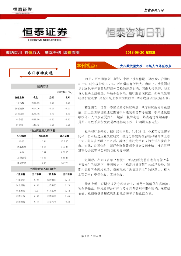 恒泰咨询日刊:三大指数放量大跌,市场人气降至冰点