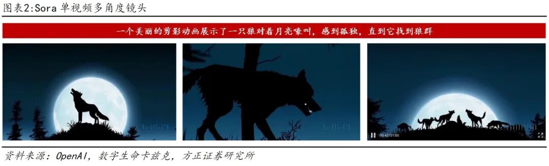 在OpenAI的展示视频中一只狼对着月亮嚎叫,感到孤独,直到它找到狼群,多镜头无缝切换都保持了主体的一致。
