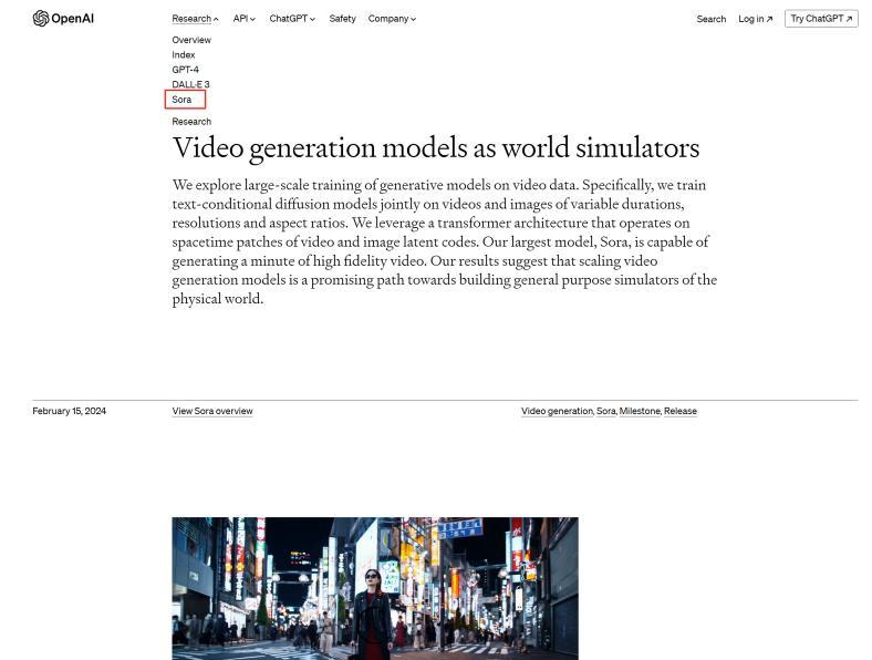 而且聊的这么热闹的Sora并未向公众开放,就连在在OpenAI的官网上,关于Sora的内容也是放入的research研究这个栏目,而不是产品的栏目,换句话说Sora还不能算是一个成熟的产品。